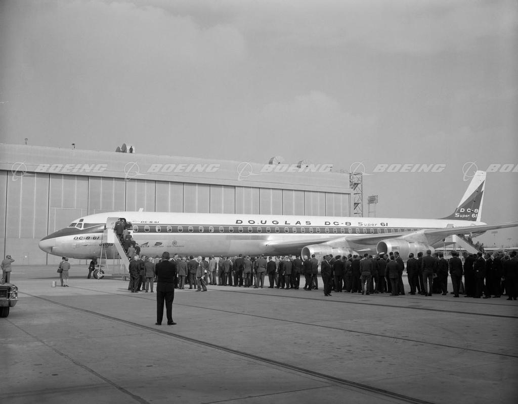 Douglas DC-8 (1958-1972): The Boeing 367-80 prototype jet transport had already made its first flight before Douglas decided to proceed with a jetliner of its own. The DC-8 was the first jet in the DC series and the first Douglas airliner to be completely built at the company’s plant in Long Beach, Ca. Powered by four turbofan jet engines and capable of speeds nearly 600 miles per hour, the DC-8 made its first flight on May 30, 1958. During a 14-year production run, the DC-8 went through seven major variants for a total of 556 aircraft. The plane set world records for speed, cargo capacity and range. During a test dive in 1962, a DC-8 Series 53 became the first commercial airliner to exceed the speed of sound. With a maximum capacity of 259 passengers, the DC-8 Super 63 was the largest commercial jet flying until the Boeing 747 entered service in 1970.