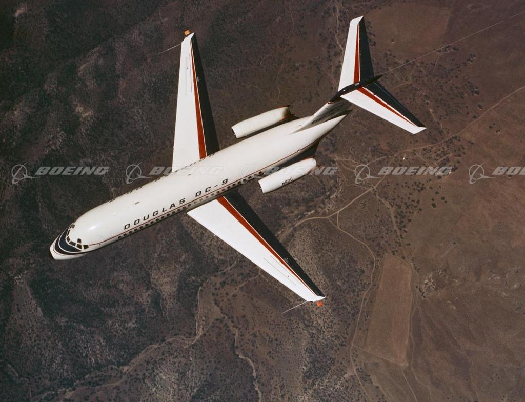 Douglas DC-9 (1965-1982): The DC-9 jetliner was designed to serve smaller airports and shorter routes than those served by the larger Boeing 727. It was developed to be a jet-age DC-3, bringing reliable jet service to any airport in the world. Smaller than the DC-8, the baseline DC-9 carried fewer passengers than some versions of the propeller driven DC-6 and DC-7 airliners. The DC-9 made its first flight on February 25, 1965, and entered service with Delta Airlines just 10 months later. It quickly became one of the most popular airlines ever built. In addition, the U.S. military ordered specially modified versions of the DC-9. The C-9A Nightingale was used by the Air Force to transport sick and injured military personnel. The Navy and Marine Corps flew the C-9B Skytrain II. Three executive transport versions were delivered to the Air Force as the VC-9C. With 976 aircraft produced in eight variations, the DC-9 ended its 17 year production run in 1982. Today, more than 800 DC-9s are still flying.