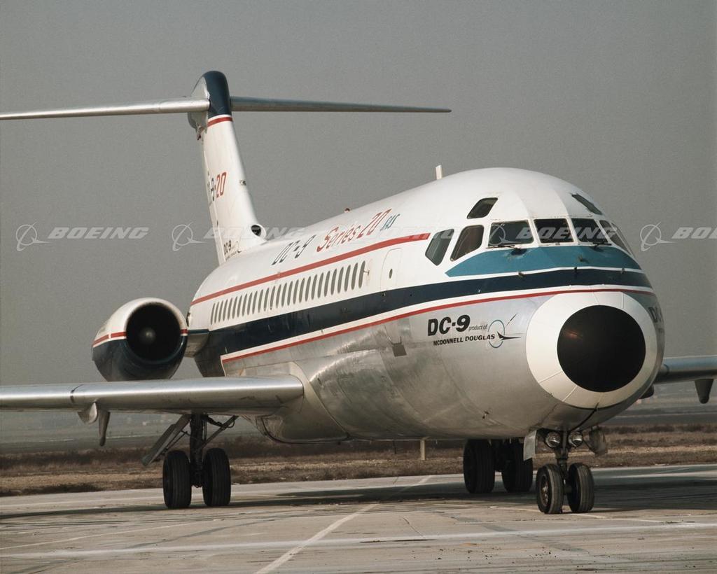 Douglas DC-9 (1965-1982): The DC-9 jetliner was designed to serve smaller airports and shorter routes than those served by the larger Boeing 727. It was developed to be a jet-age DC-3, bringing reliable jet service to any airport in the world. Smaller than the DC-8, the baseline DC-9 carried fewer passengers than some versions of the propeller driven DC-6 and DC-7 airliners. The DC-9 made its first flight on February 25, 1965, and entered service with Delta Airlines just 10 months later. It quickly became one of the most popular airlines ever built. In addition, the U.S. military ordered specially modified versions of the DC-9. The C-9A Nightingale was used by the Air Force to transport sick and injured military personnel. The Navy and Marine Corps flew the C-9B Skytrain II. Three executive transport versions were delivered to the Air Force as the VC-9C. With 976 aircraft produced in eight variations, the DC-9 ended its 17 year production run in 1982. Today, more than 800 DC-9s are still flying.