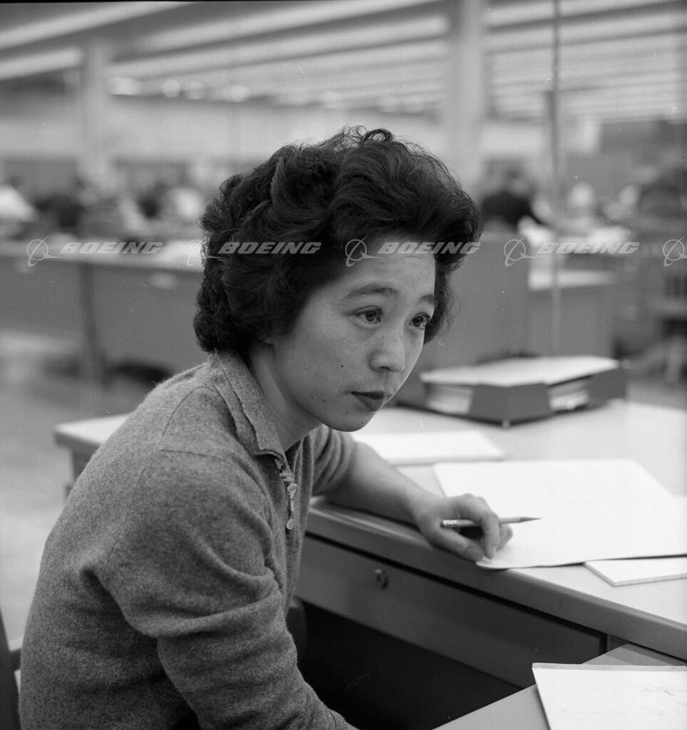 Dorothy Shimasak at her desk. She is an engineer who led the testing of rubber and plastic sealants on airplane fuel tanks in 1956.