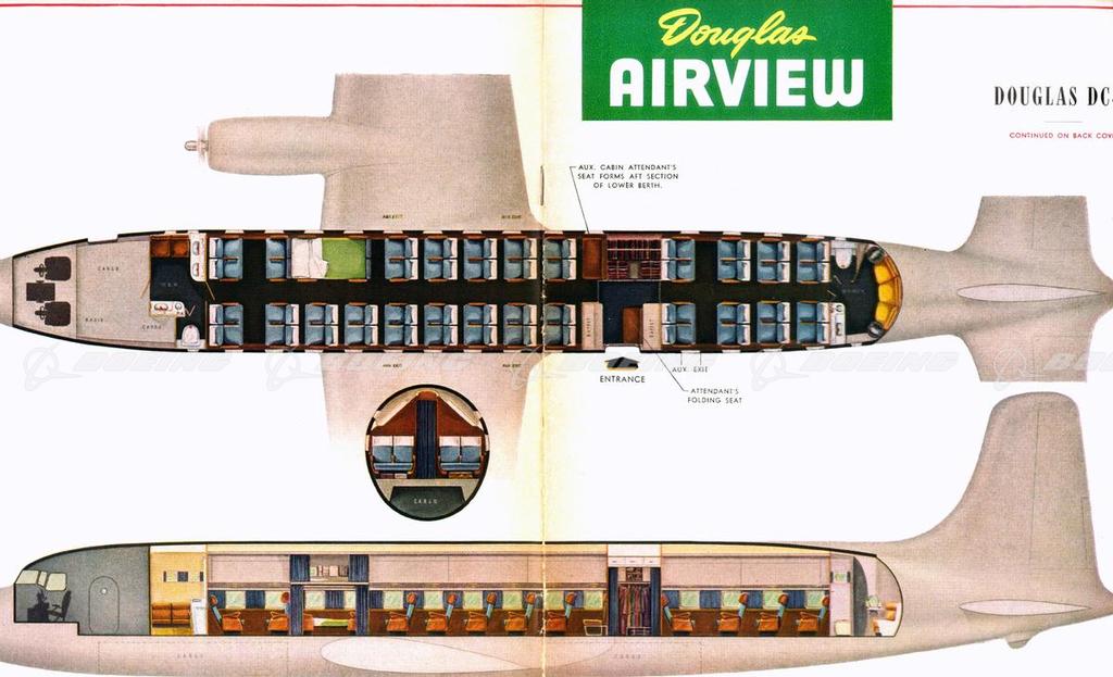 The luxurious DC-6 interior was carefully styled and designed to provide the ultimate in passenger comfort and travel relaxation. Utilizing the latest in styling techniques of the time, passenger consideration was paramount in planning the DC-6 interior. From the rich wall fabrics in pastel shades that have both eye appeal and sound absorption qualities, to the unseen sponge rubber under the floor coverings, no detail of refinement was overlooked. With its 7 foot ceiling height and more than 8 foot floor width, the DC-6 cabin was spacious and airy, with wide aisles and ample width seats. The DC-6 was offered in four interior arrangements.