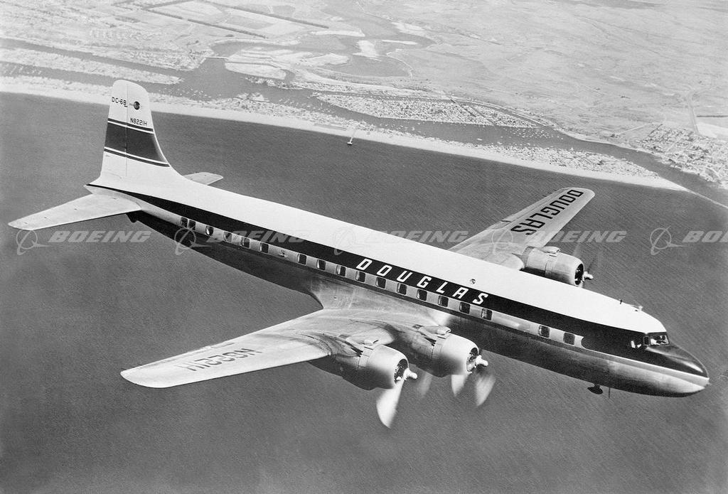 The Douglas DC-6 was one of the first airplanes to fly a regularly scheduled around-the-world route. With its higher performance, increased accommodation, greater payload and pressurized cabin, it was a natural evolution of the DC-4. The DC-6B (shown here) could seat up to 102 people and first flew Feb. 10, 1951