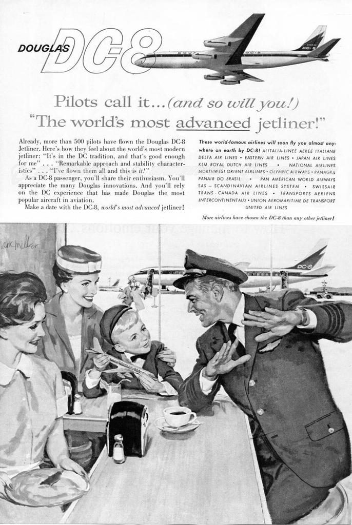 Douglas DC-8 advertisement. Text: Pilots call it...(and so will you!) "The world's most advanced jetliner!"