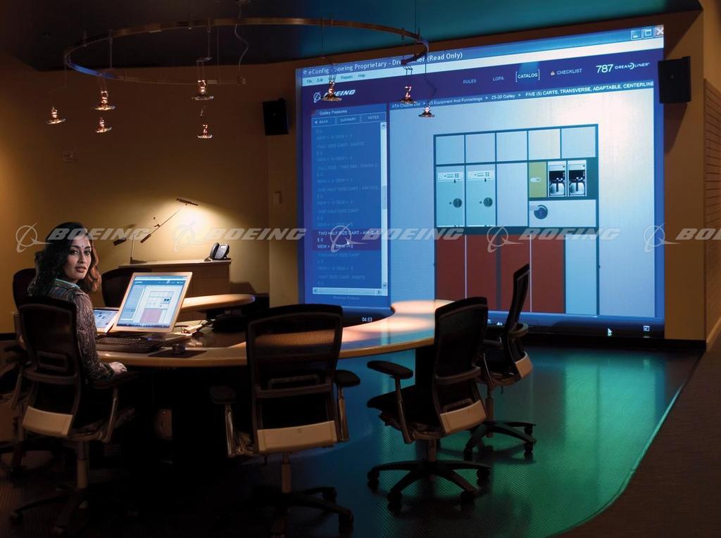 The virtual backbone of the Dreamliner Gallery is an innovative, three-dimensional configuration tool called eConfig. Showrooms include computers for customers to upload their preferences to eConfig, where customers can “walk” through virtual space and change every cabin layout, seat and galley with the click of a mouse. eConfig provides customers with an immediate virtual view of their configuration decisions, and their selections are automatically integrated with 787 engineering, manufacturing and operations.