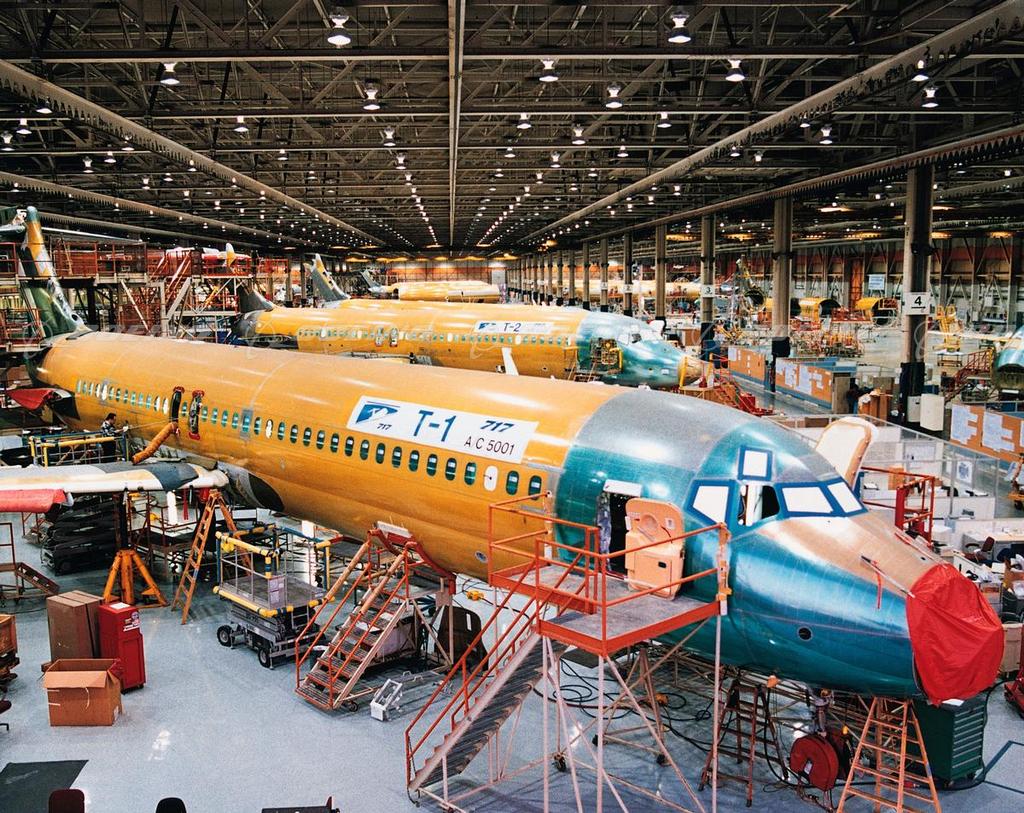 Following final assembly at the Douglas Products Division, the first four 717-200 airplanes were used in a flight test program that began in the summer of 1998. In 2000, after the merger with Boeing, the jet was assembled using a moving assembly line, an automobile production technique that had never been applied to airplanes before. In this image, the traditional stationary manufacturing methed is shown. The 717 program pioneered breakthrough business and manufacturing processes for Boeing Commercial Airplanes and concluded its 156-airplane production run in May 2006.