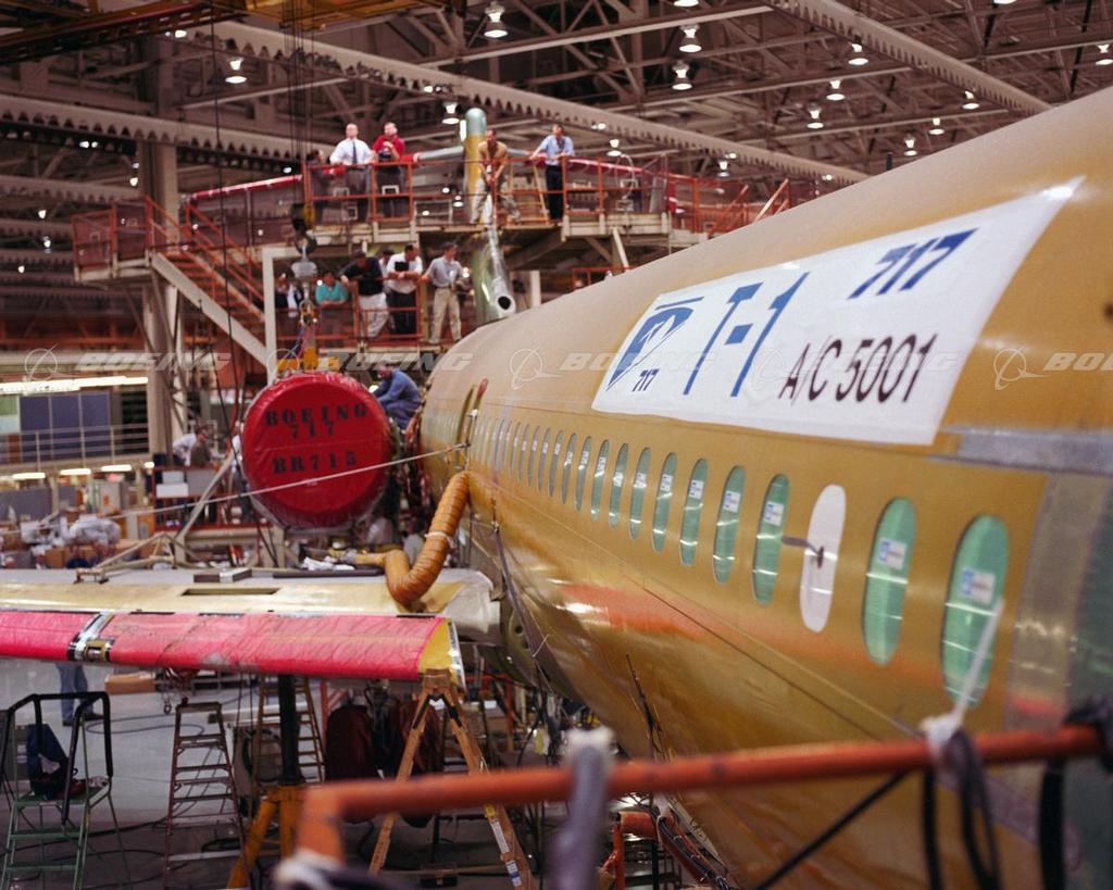 Production workers on the Boeing 717-200 Program at Douglas Products Division in Long Beach, CA, install the second of two BR715 engines on the first test airplane, designated T-1. BMW/Rolls-Royce builds the advanced BR715 engines in Dahlewitz, Germany. They feature low fuel consumption, reduced exhaust emissions and low noise levels.