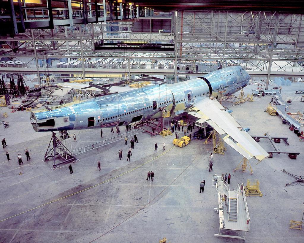 Production of the first 747s began as final phases of the Everett factory building project were completed.