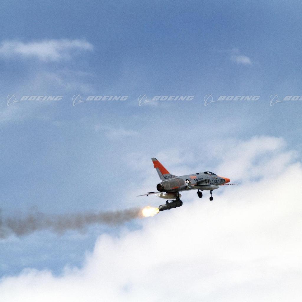 North American Aviation's F-100 Super Sabre first flew May 25, 1953, and was the first operational fighter in the world capable of maintaining supersonic speed in level flight. Of the 2,290 Super Sabres, 1,274 F-100Ds included the first autopilot designed for a supersonic jet. The F-100 had a service ceiling above 50,000 feet and a range of more than 1,000 statute miles.To demonstrate the ability of its pilots and aircraft, the Air Force chose F-100 Super Sabres to perform throughout the world in aerial precision demonstration flights. The famed Thunderbirds, a four-man aircraft team, were viewed by over 19 million people as the storied pilots performed intricate precision maneuvers at low altitude. In Europe the Skyblazers flew similar demonstrations.