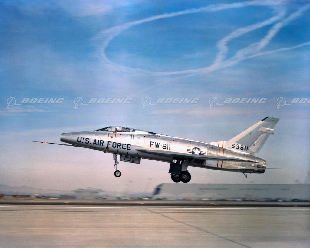 North American Aviation's F-100 Super Sabre first flew May 25, 1953, and was the first operational fighter in the world capable of maintaining supersonic speed in level flight. Of the 2,290 Super Sabres, 1,274 F-100Ds included the first autopilot designed for a supersonic jet. Powered by a 16,950-pound-thrust afterburning jet engine, the F-100 was armed with four 20-millimeter cannons, two GAM 83A Bulldog missiles, four Sidewinder missiles, rockets, special stores, and/or 7,040 pounds of bombs.