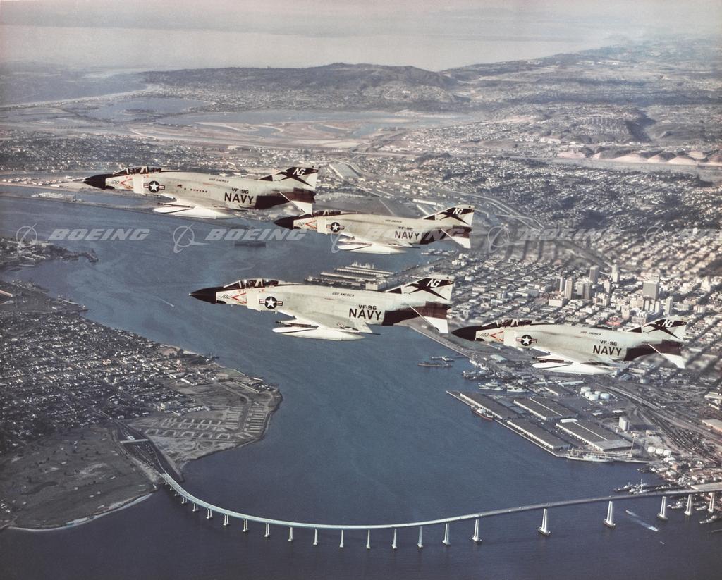 Four McDonnell Douglas F-4J Phantom II fighter aircraft from VF-96 Fighting Falcons fly over San Diego, CA and the Coronado Bay Bridge. From 1958 to 1979, when the production line stopped, a total of 5,195 F-4 Phantom II aircraft were built.