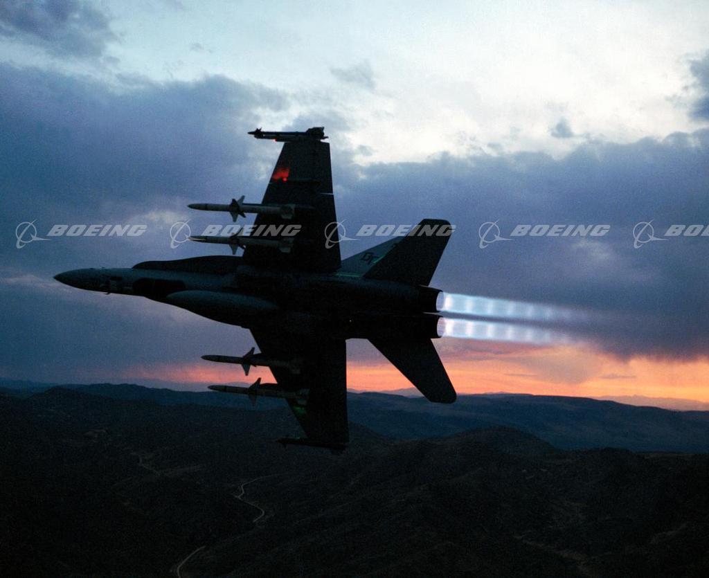 A U.S. Marine Corps F/A-18, carrying Sidewinder missiles on the wingtips and High-Speed Anti-Radiation (HARM) missiles under the wings, heads off on a night practive mission near Fallon, NV in 1992.