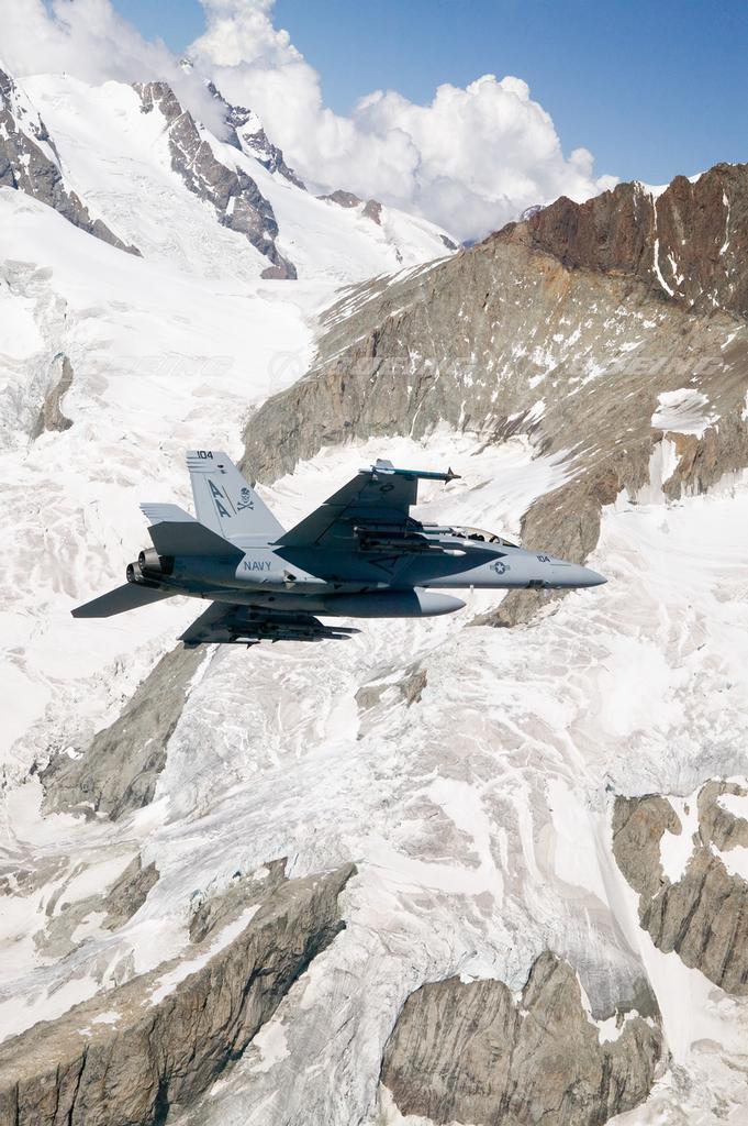 F/A-18E/F Super Hornet in Flight over Swiss Alps