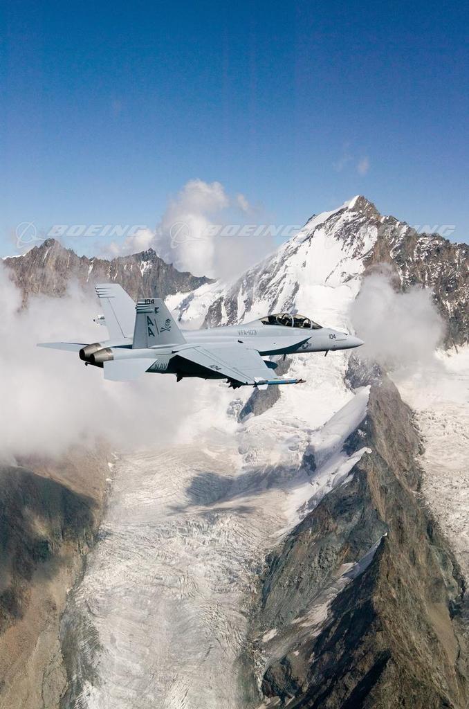 F/A-18E/F Super Hornet in Flight over Swiss Alps