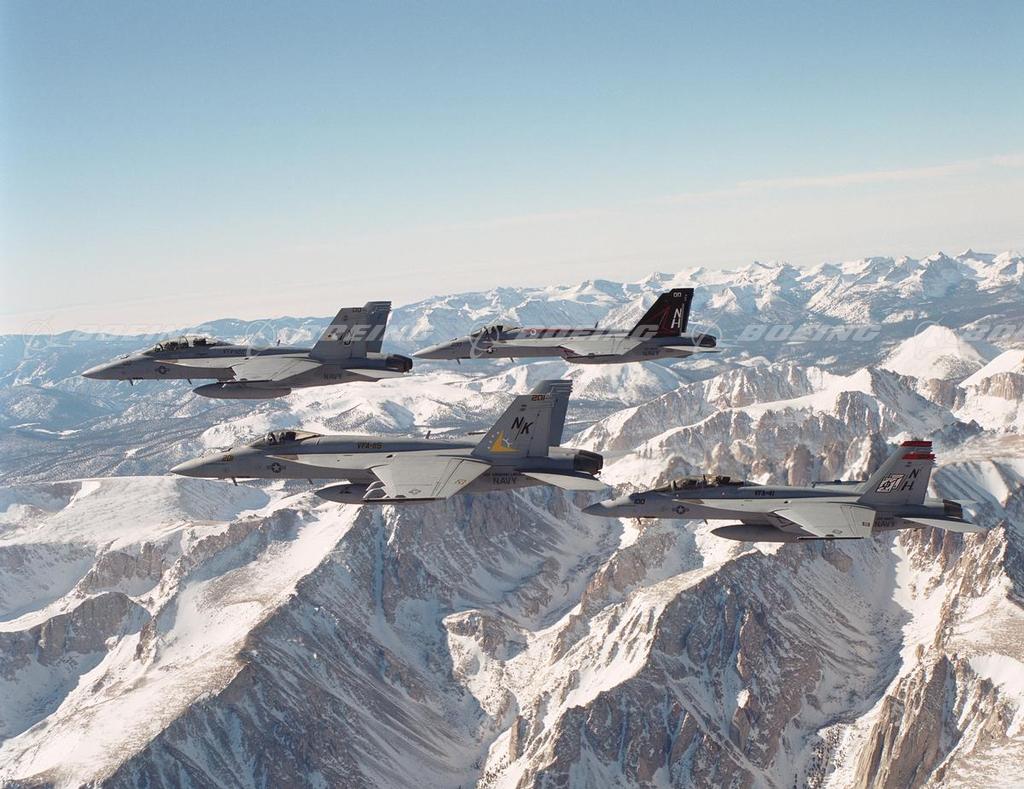 F/A-18E/F Super Hornets in Flight Above Sierra Nevada Mountains