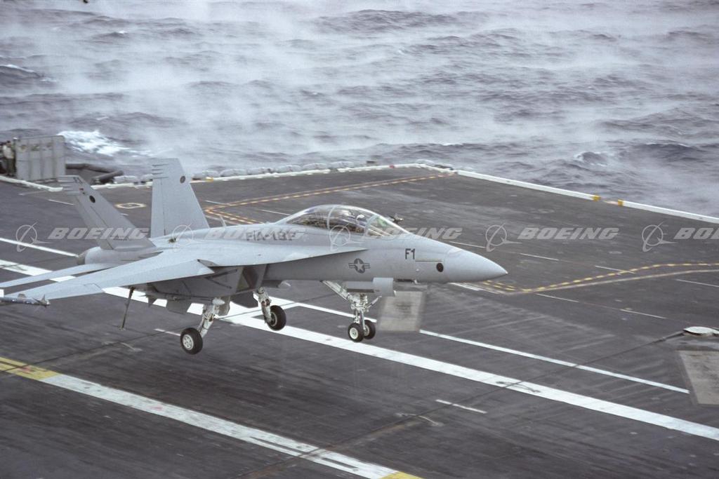 F/A-18F-1 makes a carrier landing aboard the USS John C. Stennis. U.S. Navy test pilot Lt. Frank Morley was at the controls of the two-seat Super Hornet as it made its first carrier landing and catapult launch as part of a two-week period of initial sea trials to test the aircraft's ability to operate from the deck of a carrier.