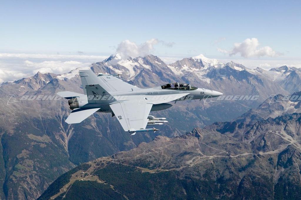 F/A-18E/F Super Hornet in Flight over Swiss Alps