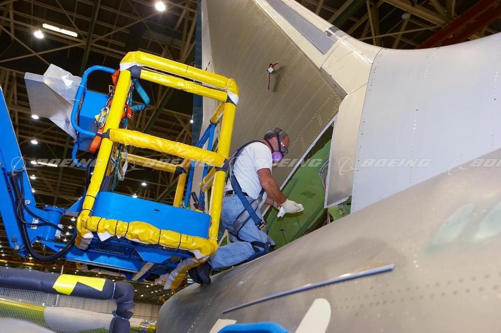 Factory Worker Accesses a 737 Tail Panel with an Automaic Lift