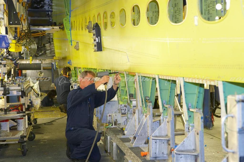 Factory Worker Drilling Floor Panels Inside a 737 Fuselage