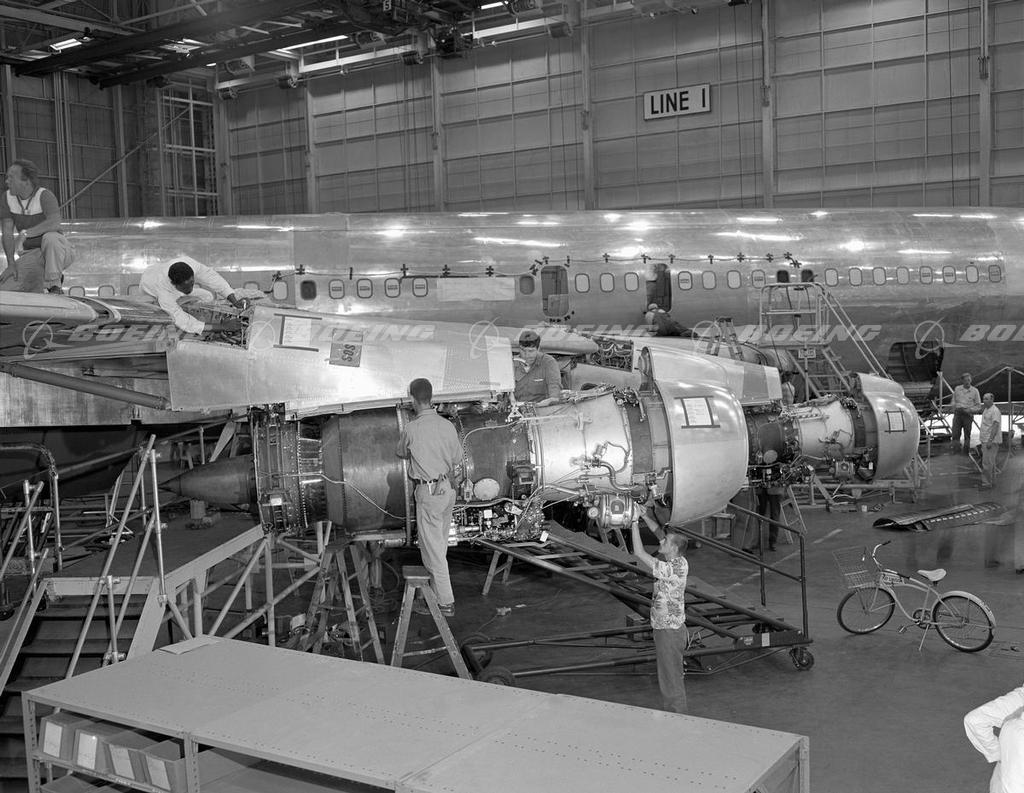 After the Air Force agreed to let Boeing build commercial jets based on the prototype 367-80, already the basis for the KC-135 military tanker, airlines began to order the 707, the commercial transport variant of the Dash 80. The 707 and the KC-135 had many features in common. Both were visually distinct, with a stinger antenna pointing forward from the top of their vertical fin. The 707's width and 100-foot length made it the largest passenger cabin in the air at the time. Placement of its more than 100 windows allowed airlines to rearrange seats. Location of passenger doors on the left side, at the front and at the rear of the cabin, became standard for subsequent Boeing jets. The exteriors of the 707 and its competitor, the DC-8, were almost identical, but the 707 wing had more sweepback, so it could fly about 20 mph faster.