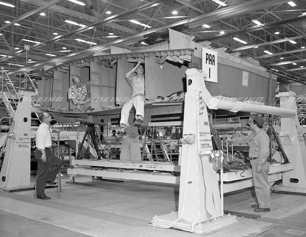 The wing stub or center section for the first Pan American World Airways Boeing 707 jet transport is shown in Boeing Airplane Company's Transport Division plant as final inspection was made prior to joining it with the right and left inboard wing sections. The joining operation, completed at the company's Transport Division plant in Renton, Wash., brought the completion of the first production 707 airplane one step closer. At the time this airplane was built, 151 Boeing 707 commercial jet transports were on order by 13 of the world's leading airlines.