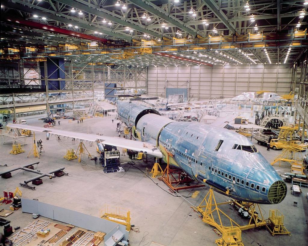 The 747 was truly monumental in size. The massive airplane required construction of the 200-million-cubic-foot 747 assembly plant in Everett, WA, the world's largest building (by volume). The fuselage of the original 747 was 225 feet long; the tail as tall as a six-story building. Pressurized, it carried a ton of air. The cargo hold had room for 3,400 pieces of baggage and could be unloaded in seven minutes. The total wing area was larger than a basketball court. Yet, the entire global navigation system weighed less than a modern laptop computer.