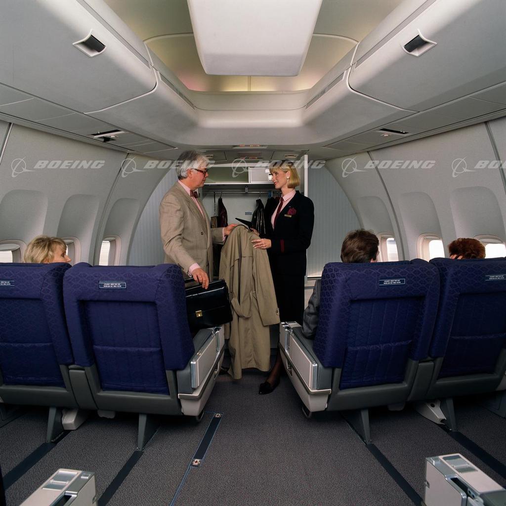 A flight attendant assists a passenger with his coat on the lower deck passenger cabin of the 747.