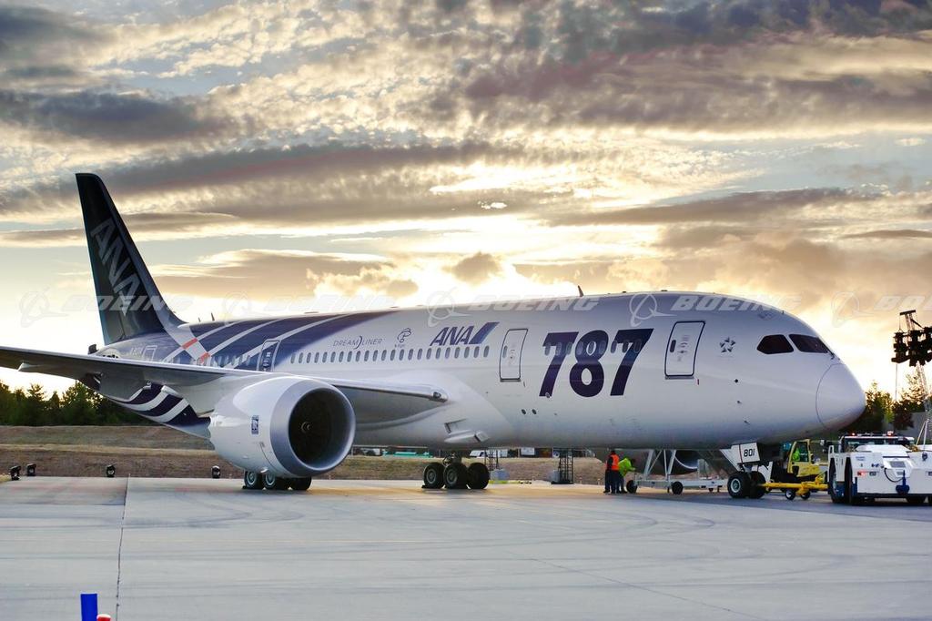 The first Boeing 787 Dreamliner that will enter into service with launch customer ANA rolled out of the paint hangar on Aug. 26, 2011. The airplane bears a special livery signifying the core element's of ANA's service brand – innovation, uniqueness and the inspiration of Japan.