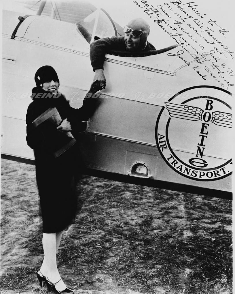 Boeing Air Transport was the first transcontinental carrier of passengers by air. Shown here is the first passenger, Jane Eads, a reporter for the Chicago Herald and Examiner, as she thanks the landing pilot, C. Eugene Robinson after landing at Crissy Field in San Francisco. The flight from Maywood, IL to San Francisco, CA in 1927 took 22.5 hours, and was without many of the conveniences of modern air transport.