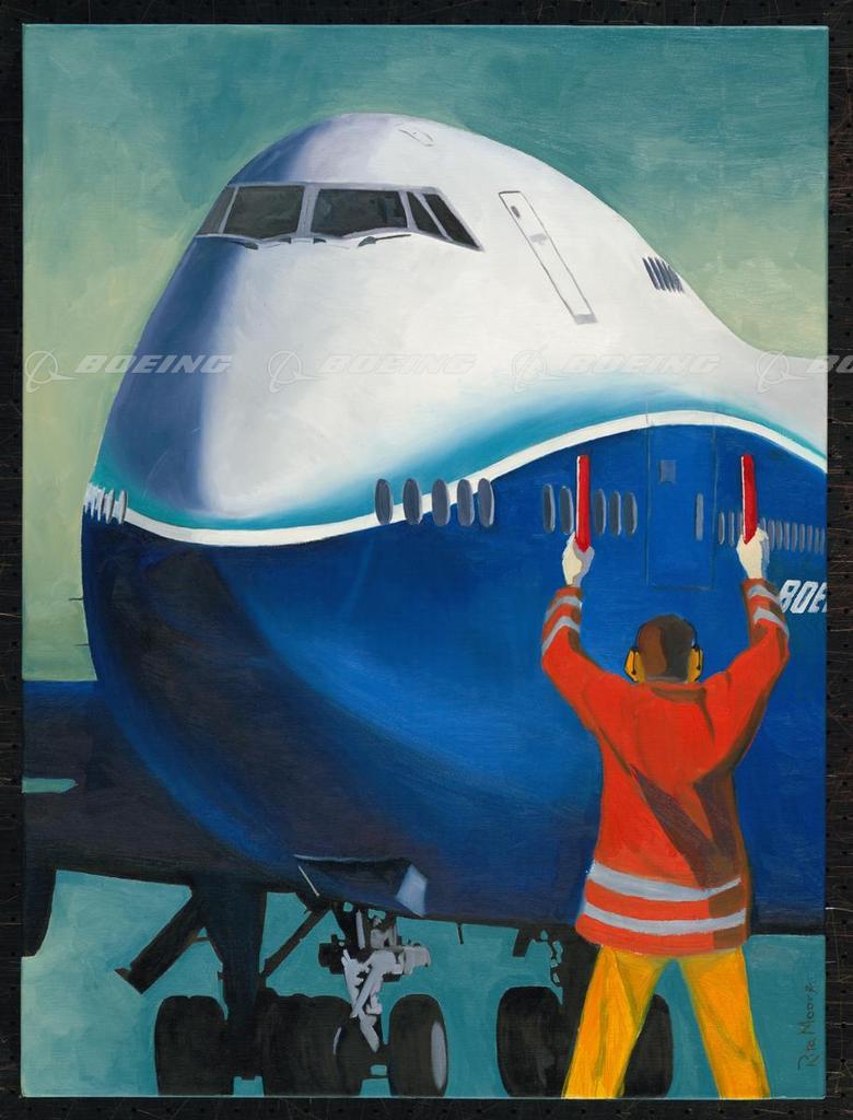 Ground Crew Guides a 747-400 Taxiing on the Ground