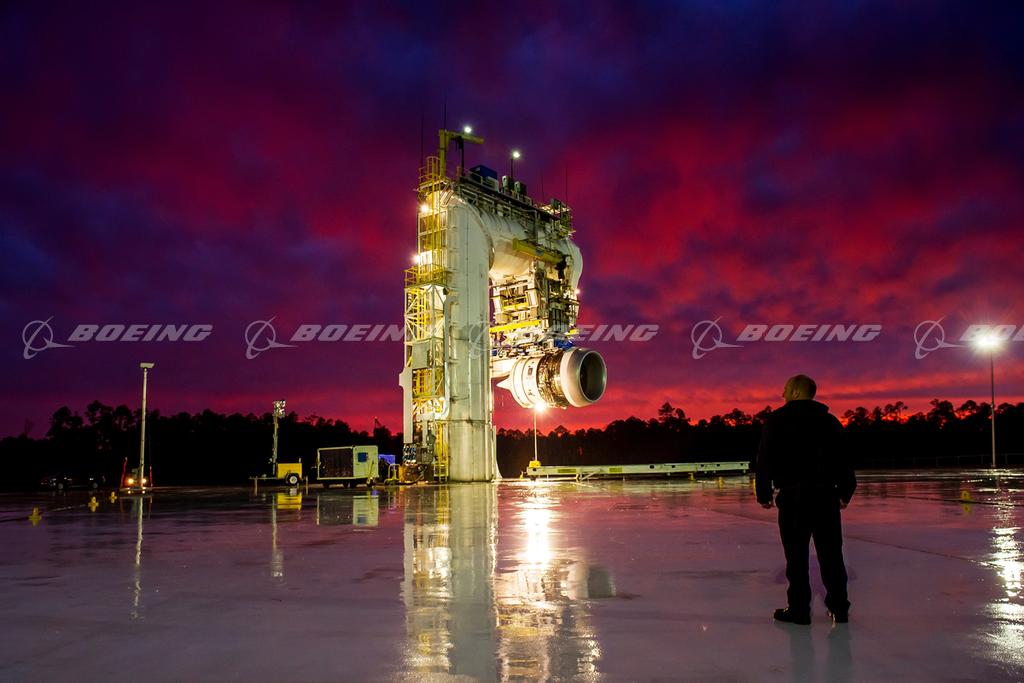 Ground testing of an engine exhaust nozzle made of ceramic matrix composite (CMC), which is designed to make engines quieter, lighter and more efficient. Boeing Research & Technology led the test team, which included engineers from Commercial Airplanes and Rolls-Royce. The CMC nozzle is installed on the back of a Rolls-Royce Trent 1000 engine at the engine manufacturer’s test facility in Stennis, Mississippi. The test focused on three areas: validating and correlating temperature predictions, demonstrating installation of the CMC nozzle on the engine and accumulating run time on an engine to qualify the nozzle for flight testing. New-generation engines on commercial airplanes are more efficient, but require materials capable of withstanding higher temperatures than previous engines. Ceramic matrix composites offer the potential of better thermal and structural performance while helping to reduce weight and acoustic footprint. The work is in support of the Federal Aviation Administration’s Continuous Lower Energy Emissions and Noise (CLEEN) Program. The CLEEN Program is a cost-share program with the FAA to conduct ground and flight demonstrations of airframe and engine technologies with the potential of reducing greenhouse gas emissions and community noise.