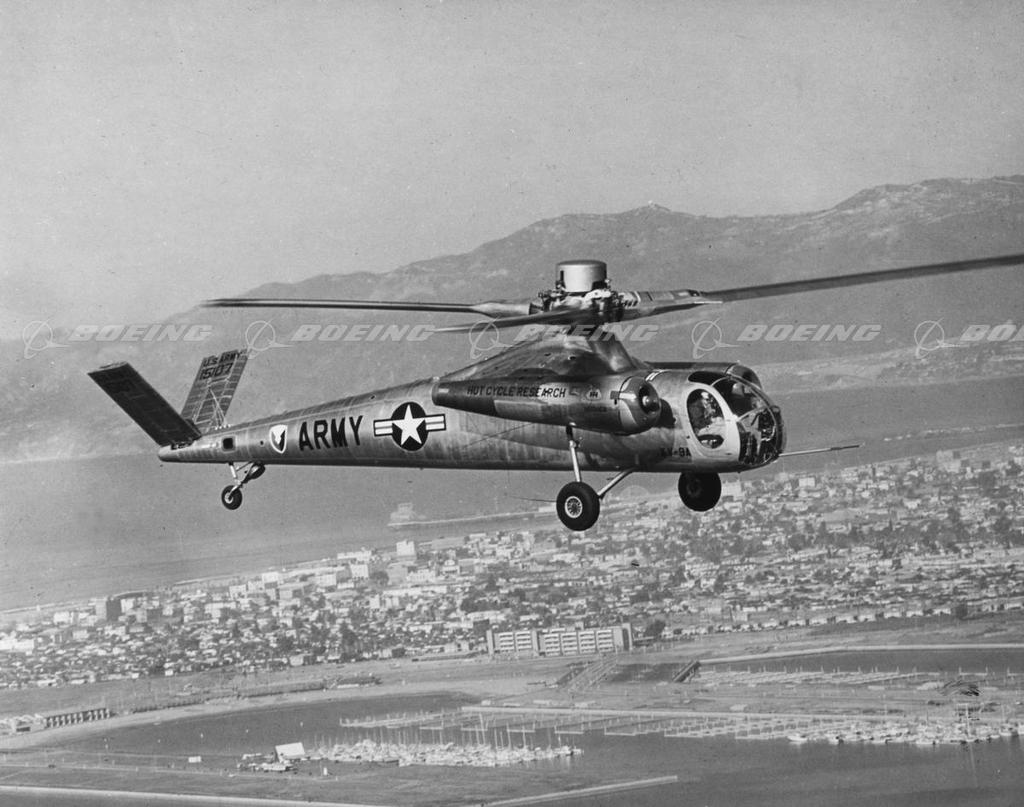 The XV-9A hot cycle aircraft being flown by Hughes test pilot Bob Ferry over Marina Del Rey, California in 1964.