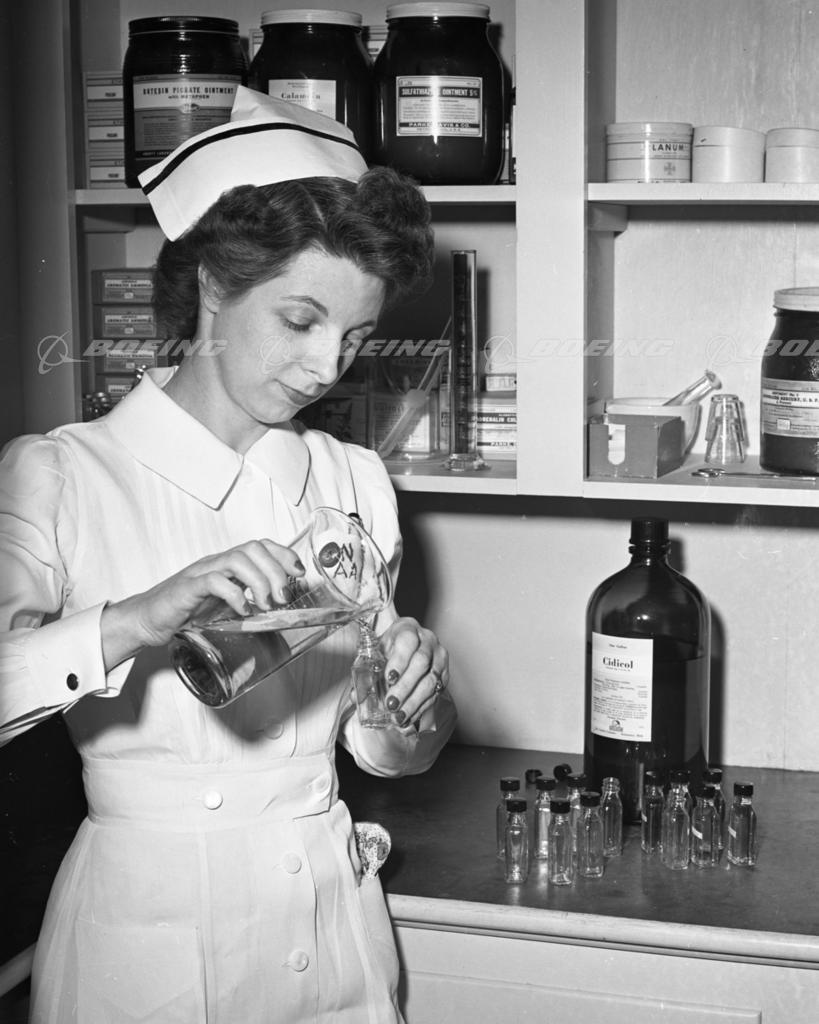 Industrial nurse at work in a dispensary. North American Aviation KC 1943