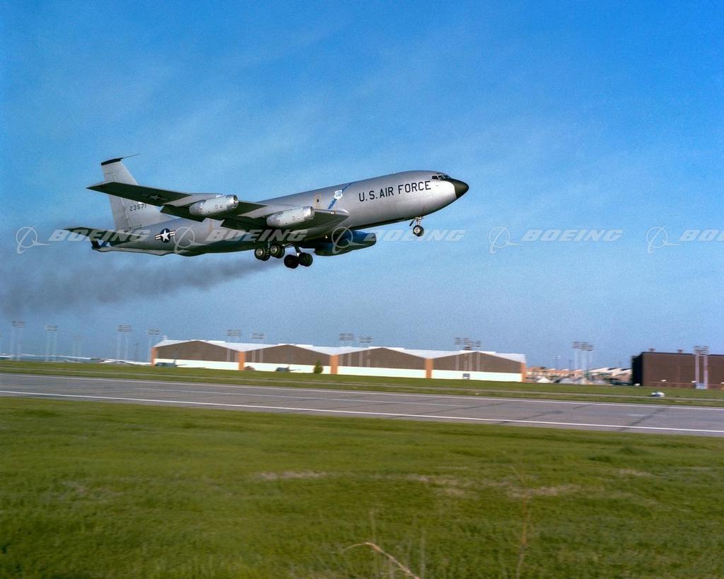 The KC-135 was the only jet airplane designed specifically for aerial refueling. More than 732 KC-135s were built, and most, with modifications, remain in service into the 21st century. The KC-135 shared the Dash-80 prototype with the Boeing 707 commercial transport, but was launched first in 1956. The KC-135's aerial refueling equipment in the lower deck leave the upper deck clear for 25 tons of cargo or 80 troops. KC-135s supplied warplanes with fuel during the Persian Gulf conflict, Operation Enduring Freedom over Afghanistan, and for homeland defense.