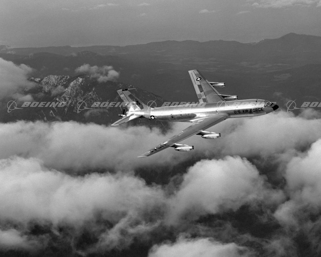The KC-135 was the only jet airplane designed specifically for aerial refueling. More than 732 KC-135s were built, and most, with modifications, remain in service into the 21st century. The KC-135 shared the Dash-80 prototype with the Boeing 707 commercial transport, but was launched first in 1956. The KC-135's aerial refueling equipment in the lower deck leave the upper deck clear for 25 tons of cargo or 80 troops. KC-135s supplied warplanes with fuel during the Persian Gulf conflict, Operation Enduring Freedom over Afghanistan, and for homeland defense.
