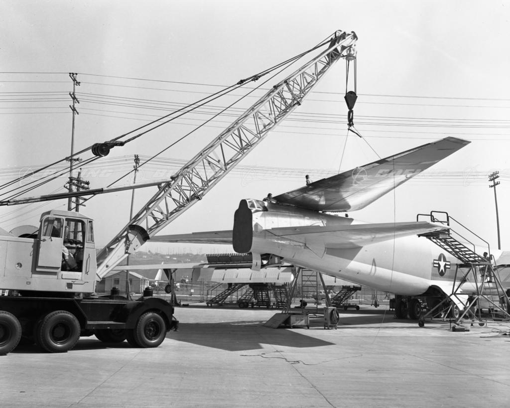 Lifting B-52 hinged vertical tale - circa 1955