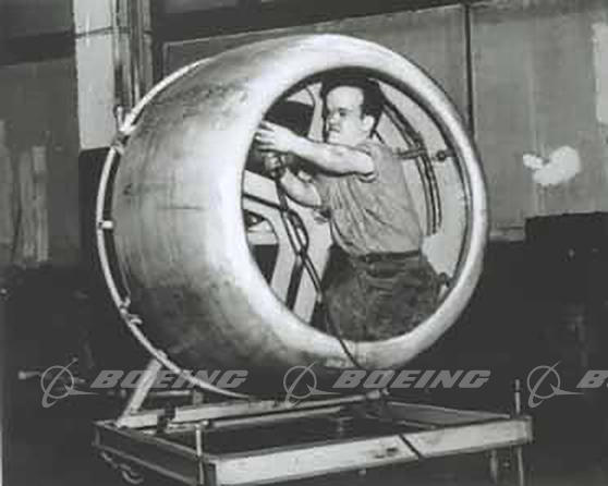 Little Person riviting engine Douglas Airview at Santa Monica Plant, WWII