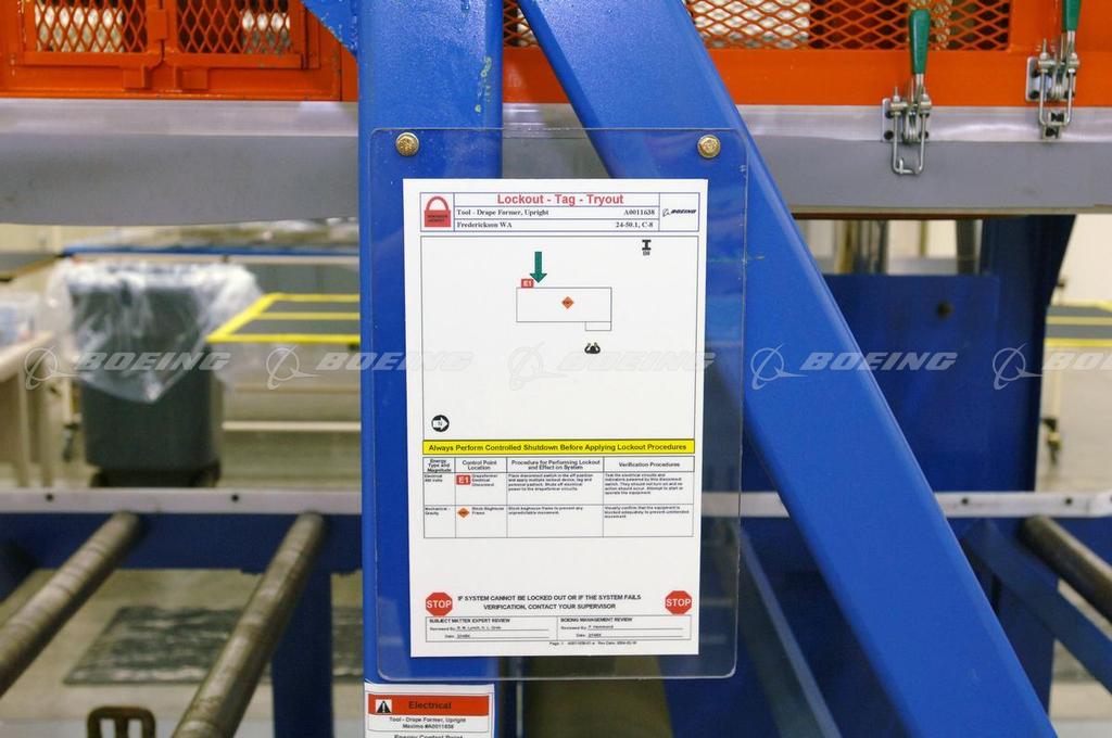 A Lockout Tag for safety control is shown on critical machinery at the Boeing composites manufacturing facility in Frederickson, Washington.