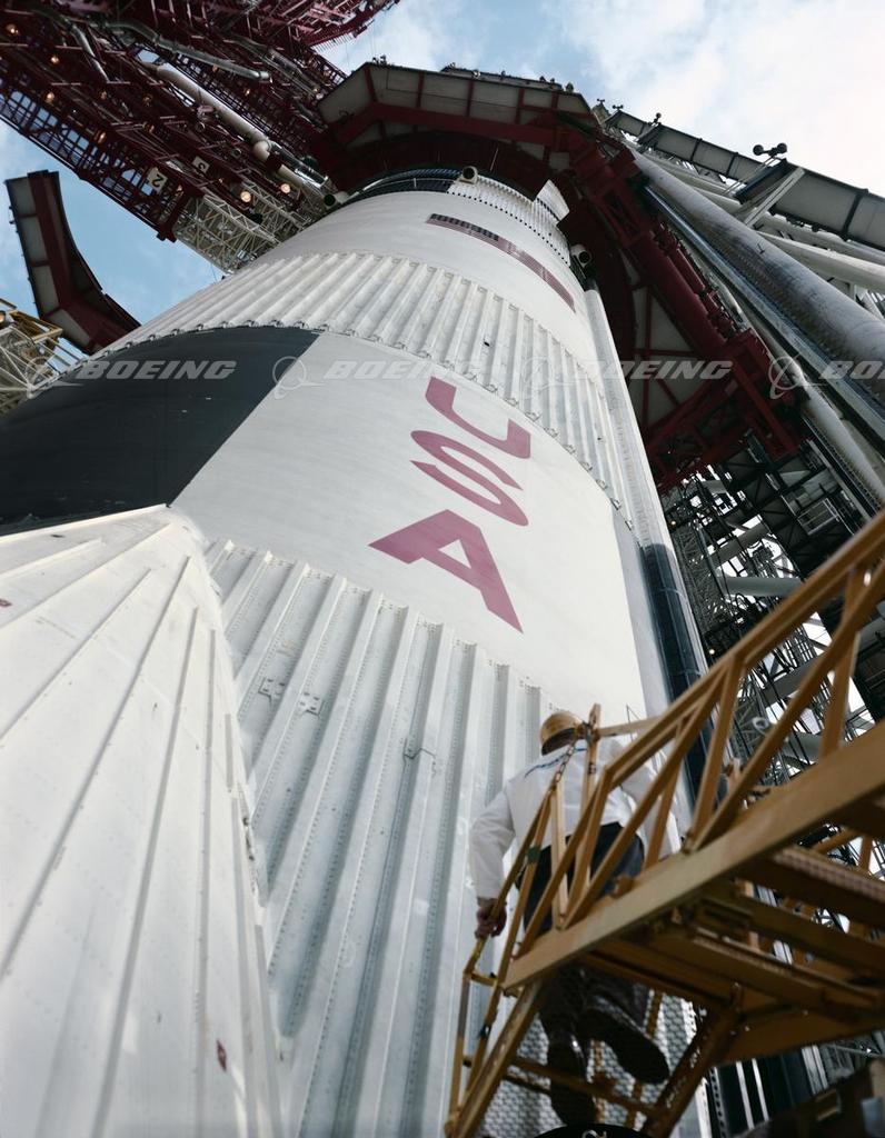 The 363-foot-tall Saturn V rocket first was launched Nov. 9, 1967 and was the launch vehicle for Project Apollo and Skylab. Boeing built the rocket’s massive S-1C first stage, North American the S-II second stage, and McDonnell Douglas the S-IVB third stage. Rocketdyne built the first stage’s five F-1 engines and the J-2 engine for the rocket’s second and third stages. Twelve Saturn Vs were used on the Apollo moon exploration program, and the 13th, in 1973, placed the McDonnell Douglas Skylab into Earth orbit. Two were placed in storage.