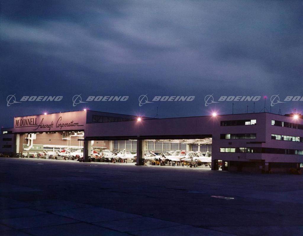 McDonnell Aircraft Corp. mfg and flight test hangar at airport. Planes seen are 1200mph F-101 Voodoo fighter plane for Air Force and F4H Phantom II fighter planes for navy which fly faster than 1500 mph.