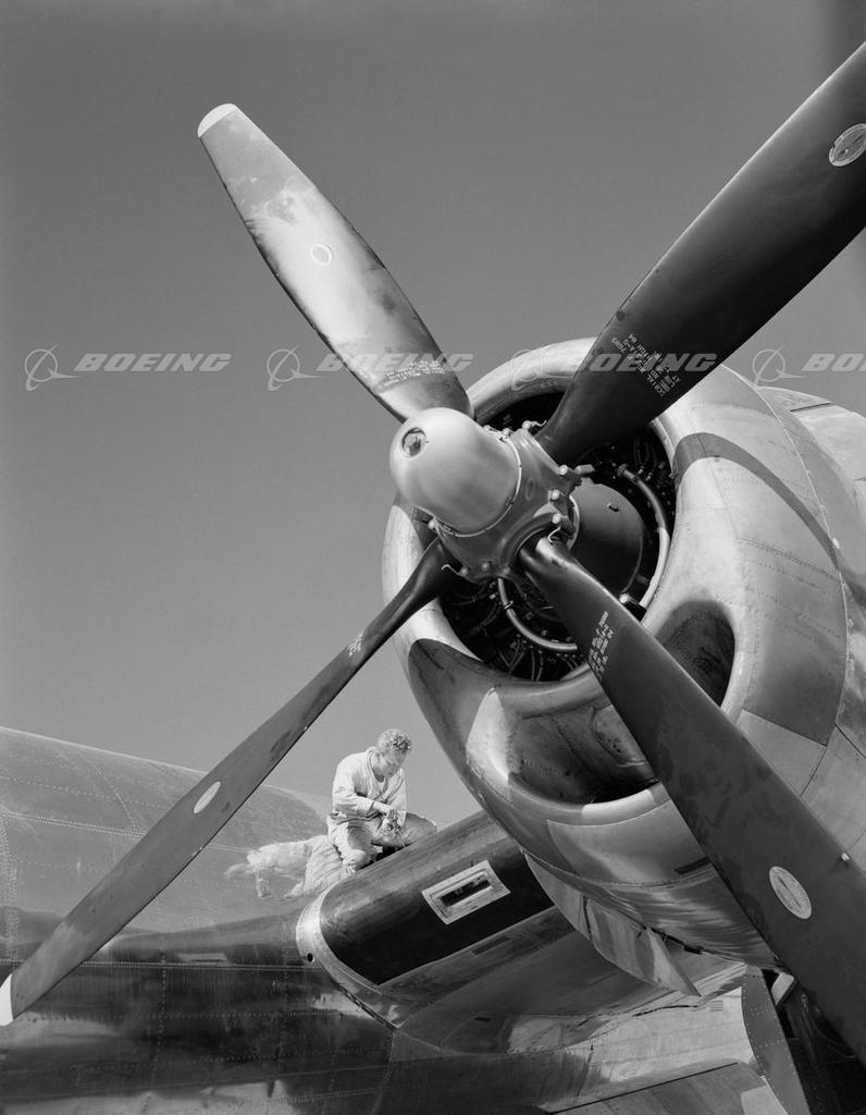Mechanic Servicing a B-29 Superfortress, Dwarfed by Propeller