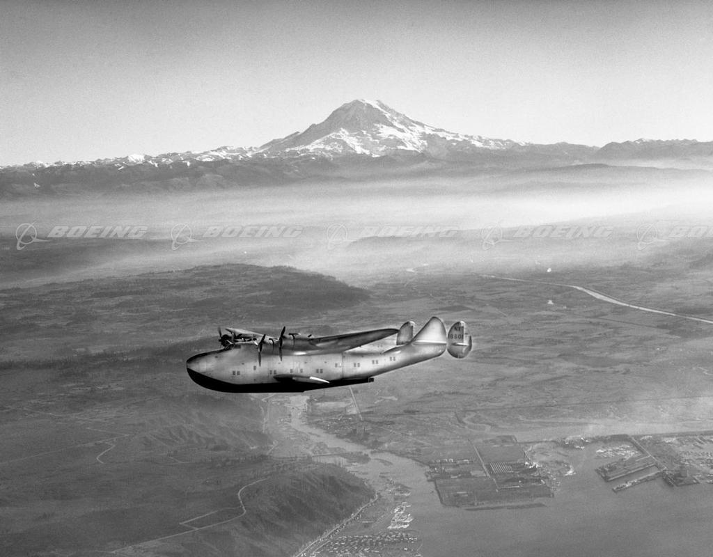 Boeing Model 314 Clipper with Mt. Rainier in the background.
