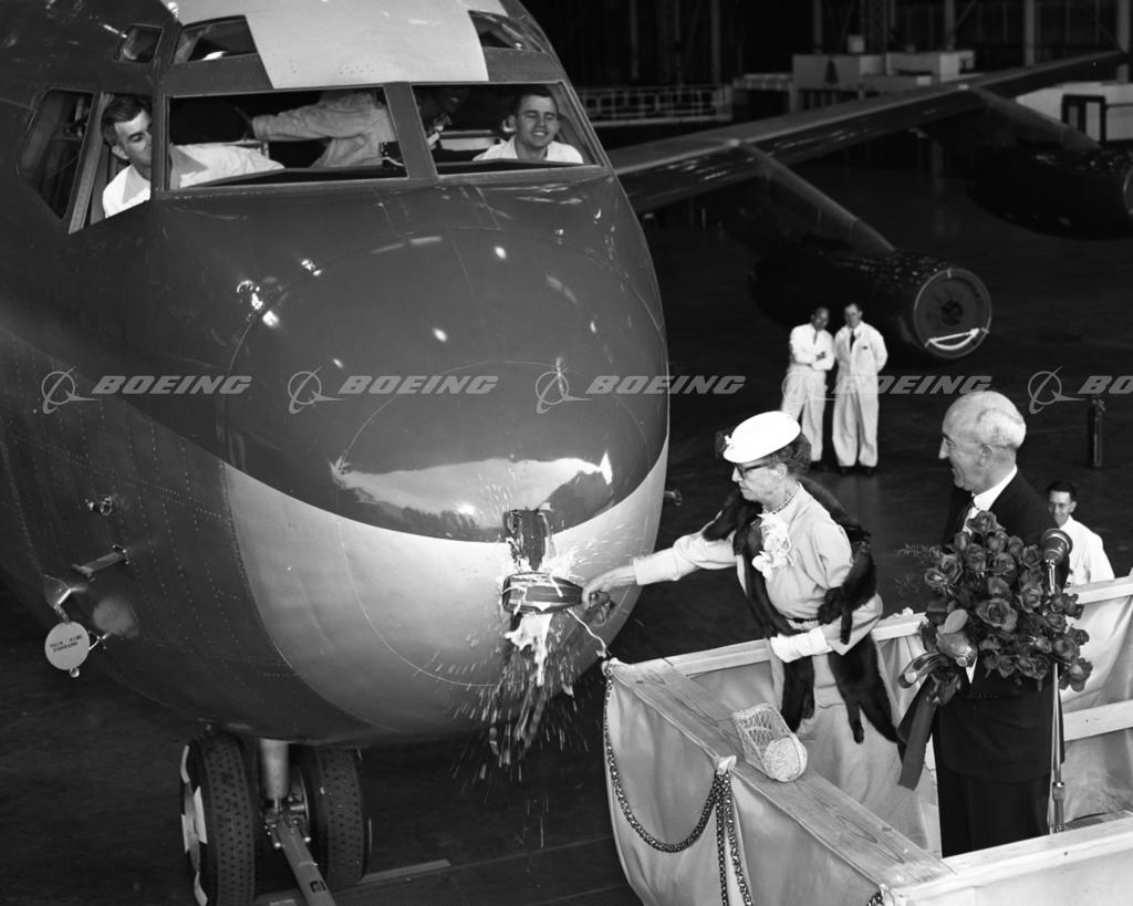 Mrs. William Boeing Christens the Boeing Dash 80 Prototype
