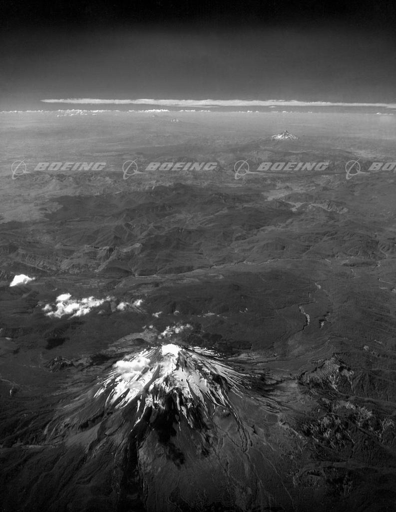 This aerial view of western Washington and Oregon, taken from 35,000 feet, reduces the densely-wooded Cascade Mountain Range to mere plush-covered foothills. The snow-capped peak in the foreground in Washington's 12,307-foot Mount Adams. To the upper left is Oregon's Mount Hood: behind and to the right of Hood, and in the far distance are Mount Jefferson and the famous Three Sisters. This striking picture was made by Boeing Airplane Company flight test crewmen aboard a Boeing C-97 Stratofreighter.