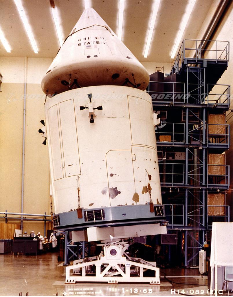The North American Aviation-built Apollo capsule is tested at NAA's Downey facility in California in January 1965.