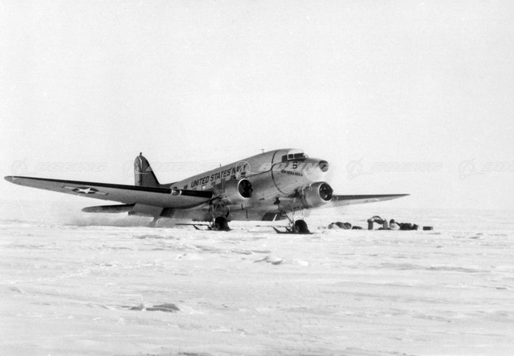 A Navy R4D Skytrain, piloted by Lt. Cmdr Conrad "Gus" Shinn taking off from South Pole for McMurdo Sound, Antarctica in 1956. The plane, nicknamed Que Sera Sera, was the first airplane to land on the continent of Antarctica.