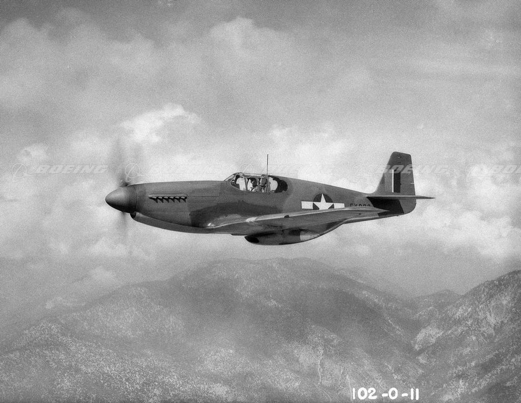 North American Aviation's powerful and agile P-51 was the first single-engine aircraft based in England to penetrate Nazi Germany during World War II. With its superior aerodynamics, the Mustang outperformed enemy planes and went on to establish an impressive aerial record. It first flew in 1941 and was initially designed for the British Royal Air Force for fighter reconnaissance. By war's end North American built 15,575 P-51 Mustangs. The P-51D Mustang had a wingspan of 37 feet and was 32 feet long. Powered by one 1,490- horsepower engine, it flew 437 mph with a range of 2,300 miles.