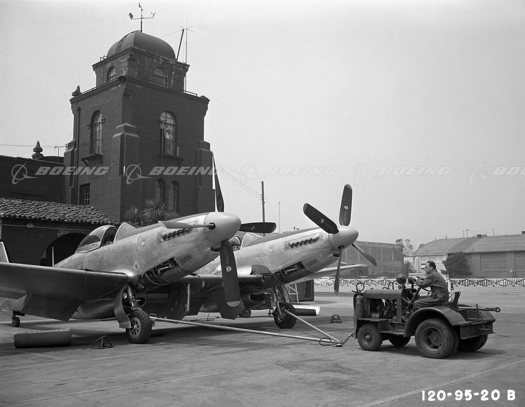 The North American P-82 Twin Mustang was the climactic development of a long series of the famous World War II P-51 Mustang series. North American produced 250 of the double-fuselaged airplanes for the Air Force, embracing three versions of the Twin Mustang then in service, the P-82E, P-82F, and P-82G. The versatility of the P-82 made it potentially adaptable to a wide variety of roles in modern aerial warfare. It could have been used as a fighter, a long-range escort, long-range reconnaissance, night fighter, attack bomber, rocket fighter or an interceptor. With a speed of more than 475 miles an hour, the Twin Mustang had a combat range of over 1,600 miles with full armament. Range could be extended by use of external drop tanks on the wings. A radical departure from the conventional single-fuselage airplane, the Twin Mustang was formed by two fuselages joined by the wing and the horizontal stabilizer. With a pilot in each fuselage, it reduced the problem of pilot fatigue on ultra-long-range missions. The P-82F and G models carried a radar operator in the right cockpit instead of a co-pilot.