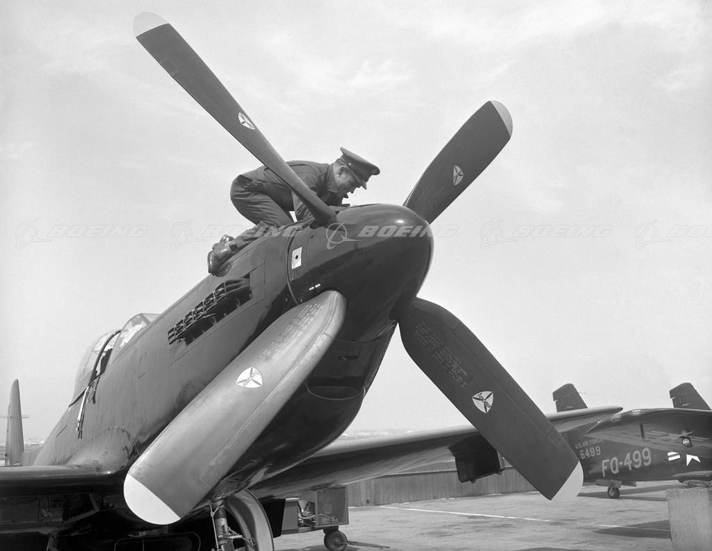 The North American P-82 Twin Mustang was the climactic development of a long series of the famous World War II P-51 Mustang series. North American produced 250 of the double-fuselaged airplanes for the Air Force, embracing three versions of the Twin Mustang then in service, the P-82E, P-82F, and P-82G. The versatility of the P-82 made it potentially adaptable to a wide variety of roles in modern aerial warfare. It could have been used as a fighter, a long-range escort, long-range reconnaissance, night fighter, attack bomber, rocket fighter or an interceptor. With a speed of more than 475 miles an hour, the Twin Mustang had a combat range of over 1,600 miles with full armament. Range could be extended by use of external drop tanks on the wings. A radical departure from the conventional single-fuselage airplane, the Twin Mustang was formed by two fuselages joined by the wing and the horizontal stabilizer. With a pilot in each fuselage, it reduced the problem of pilot fatigue on ultra-long-range missions. The P-82F and G models carried a radar operator in the right cockpit instead of a co-pilot.