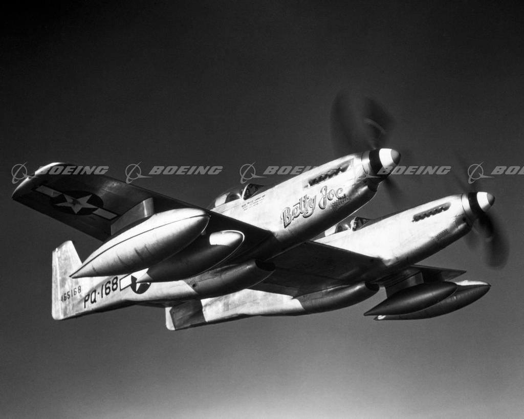 The P-82 Twin Mustang/F-82 Twin Mustang fighter first flew June 15, 1945. Looking like two Mustang fuselages on one wing, its twin cockpits allowed the pilot and copilot to share the workload on long-range missions. During the Korean conflict, the first three North Korean airplanes destroyed by U.S. forces were shot down by F-82G interceptors. The Twin Mustang had a wingspan of 51 feet 3 inches and was 39 feet long. It was adapted as a fighter, long-range escort, reconnaissance airplane, night fighter, attack bomber, rocket fighter, and interceptor.