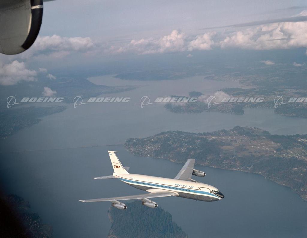 After the Air Force agreed to let Boeing build commercial jets based on the prototype, 367-80, already the basis for the KC-135 military tanker, airlines began to order the 707, the commercial transport variant of the Dash 80. The 707 and the KC-135 had many features in common. Both were visually distinct, with a stinger antenna pointing forward from the top of their vertical fin. The 707's width and 100-foot length made it the largest passenger cabin in the air at the time. Placement of its more than 100 windows allowed airlines to rearrange seats. Location of passenger doors on the left side, at the front and at the rear of the cabin, became standard for subsequent Boeing jets. The exteriors of the 707 and its competitor, the DC-8, were almost identical, but the 707 wing had more sweepback, so it could fly about 20 mph faster.
